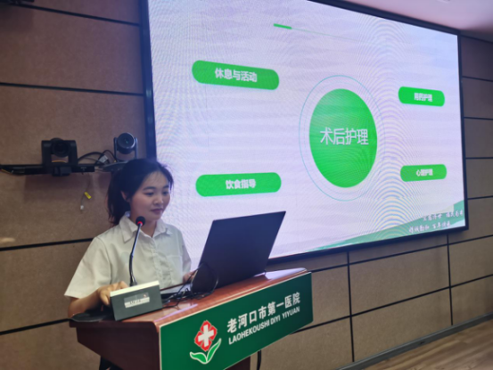 楊玫芬老師詳細匯報了直腸癌患者的術(shù)后護理,包括用藥護理、心理護理、休息與活動及飲食指導。
